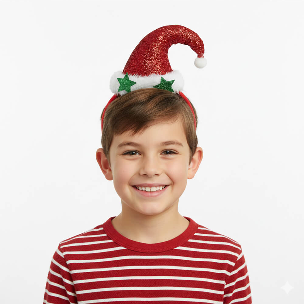 El accesorio cuenta con una base de diadema flexible que se adapta cómodamente a cualquier tamaño de cabeza, permitiendo que tanto los más pequeños como los mayores puedan usarla sin molestias. En la parte superior, destaca un minigorro de Navidad en color rojo vibrante, adornado con el característico ribete blanco y un pompón suave. Gracias a su diseño, se mantiene estable incluso mientras bailas en la cena de empresa o juegas con los niños en casa.