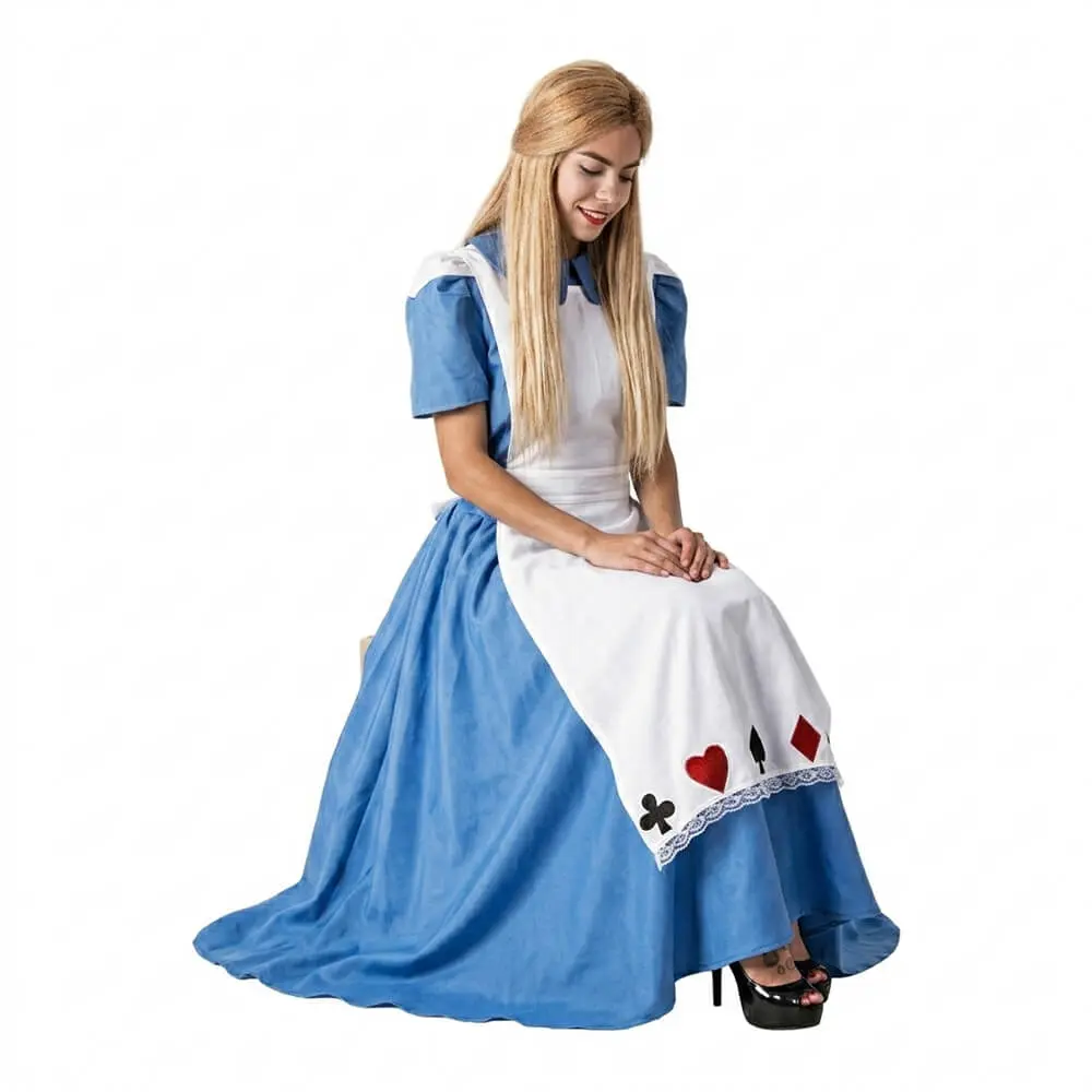 🎒 Contenido del producto: 1x Vestido azul de Alicia. 1x Delantal blanco con detalles de cartas.