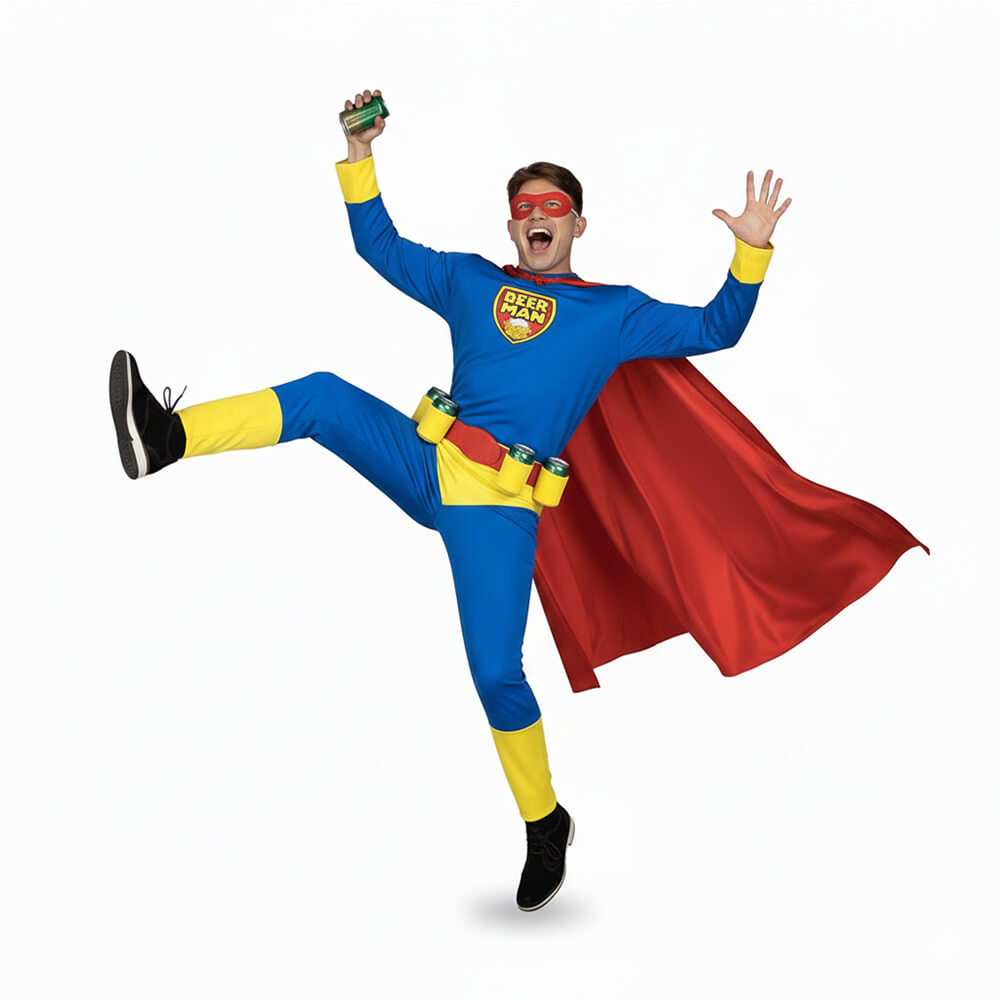 ¿Es un pájaro? ¿Es un avión? ¡No, es Beer Man! Prepárate para salvar a tus amigos de la sed con este original y divertido disfraz de superhéroe cervecero. Diseñado para quienes no temen ser el centro de atención, este traje combina la estética clásica de los cómics con un toque de humor paródico irresistible.