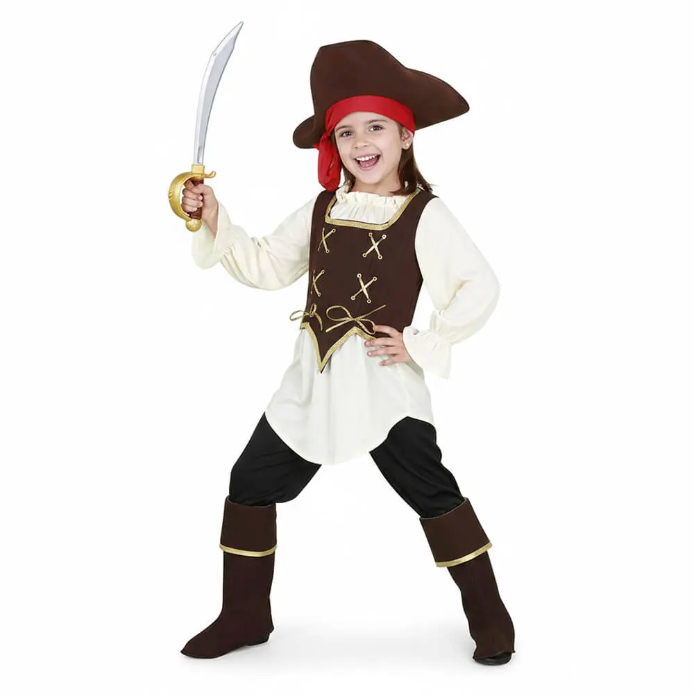 El disfraz destaca por su diseño por capas: una blusa ligera sobre la que se ajusta un corpiño que define el look pirata. El pantalón permite una movilidad total para trepar por mástiles imaginarios, mientras que los cubrebotas aseguran que el calzado habitual se integre perfectamente en el uniforme de a bordo. Para coronar el conjunto, el sombrero de pirata aporta el toque final de autoridad y estilo.