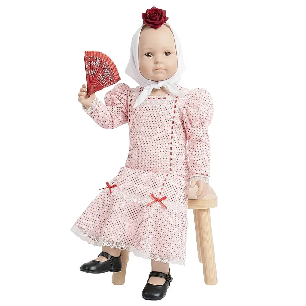 El diseño presenta el clásico vestido de lunares en tono rosa suave, decorado con pasacintas y pequeños lazos rojos que realzan su figura. Las mangas ligeramente abullonadas y el volante en el bajo con remate de encaje le otorgan ese volumen tan característico de las chulapas de verdad. Para completar el look madrileño, el conjunto incluye el imprescindible pañuelo blanco de cabeza, listo para ser coronado con una flor (no incluida).