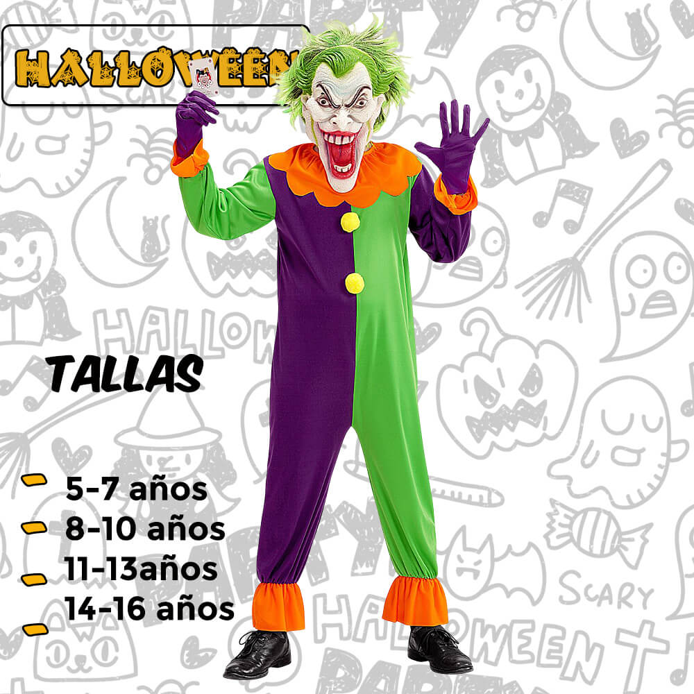 Desata el caos y el terror con este increíble disfraz de Joker Malvado. Ideal para Halloween, fiestas de disfraces o eventos temáticos. Su diseño colorido y su expresión espeluznante no pasarán desapercibidos. 🎭