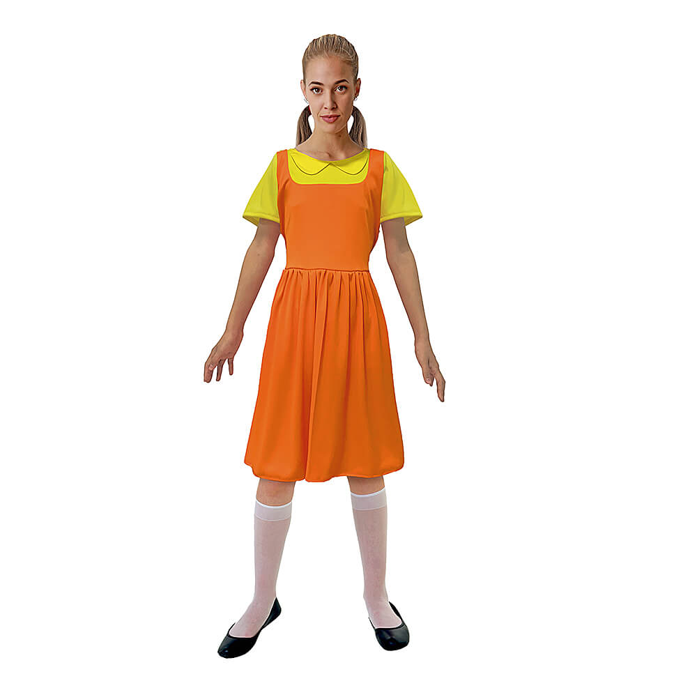 ¡Transformate en el personaje más inquietante de El Juego del Calamar! Este disfraz recrea el look icónico de la muñeca de la serie con gran detalle y fidelidad.