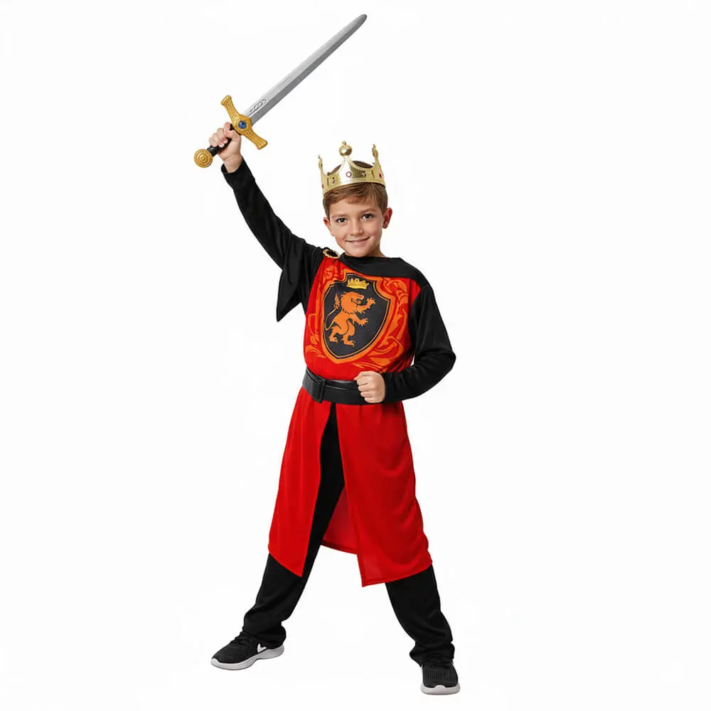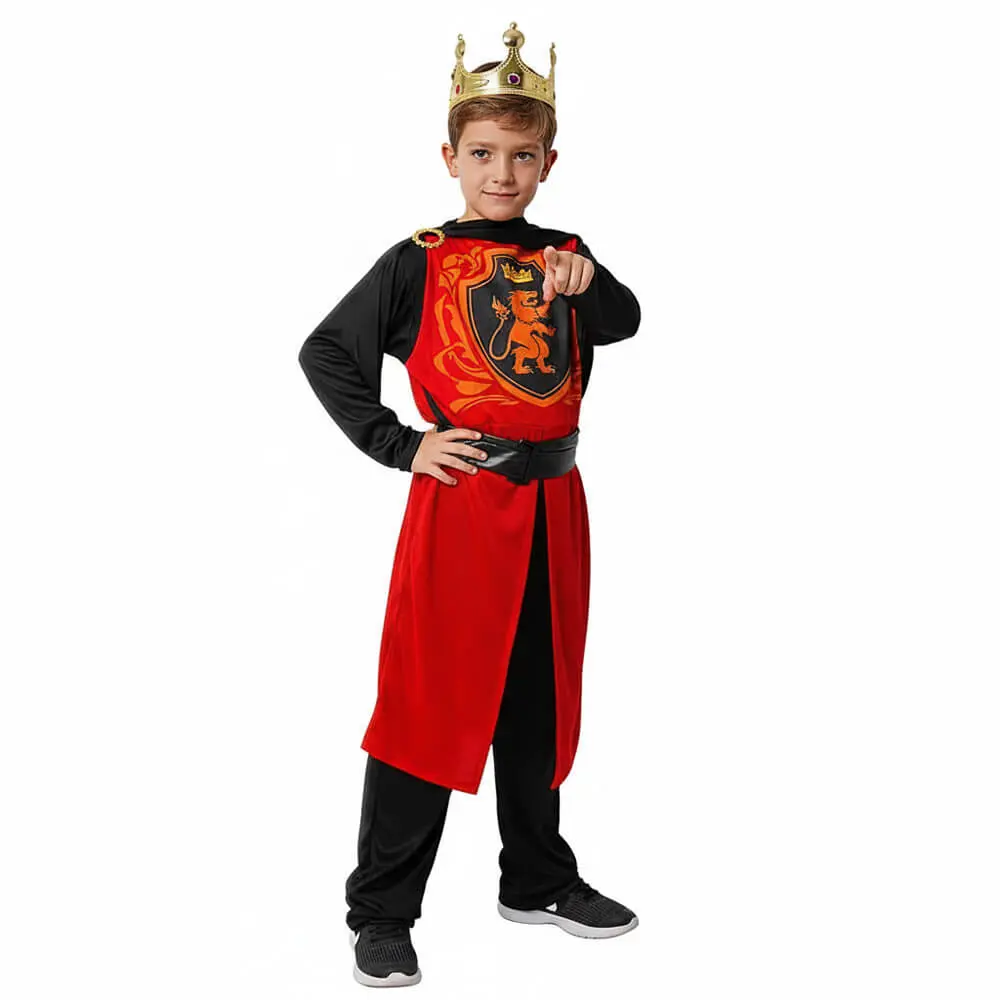 El conjunto destaca por su túnica con escudo real y su impresionante capa, que aporta un aire de autoridad a cada paso. El pantalón a juego asegura comodidad durante horas de desfile o juego, mientras que el cinturón permite ajustar la prenda para definir la silueta del monarca. Es un traje versátil que funciona tanto para representar a un rey de cuento de hadas como a un personaje histórico en mercados medievales.