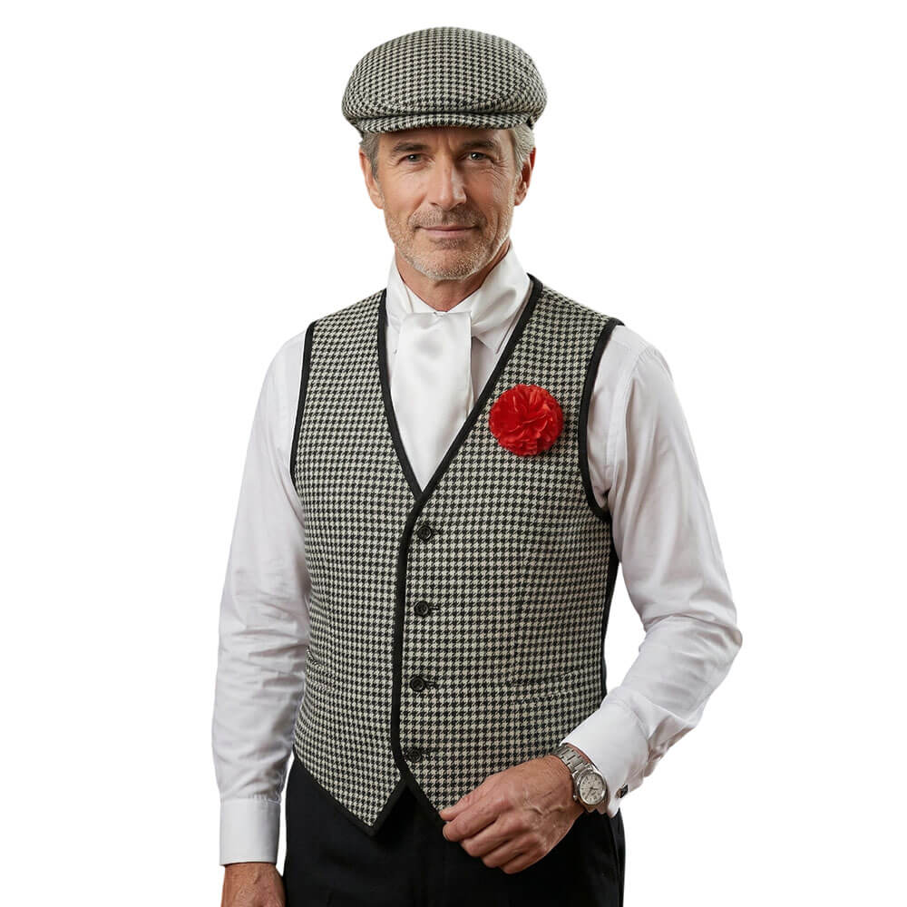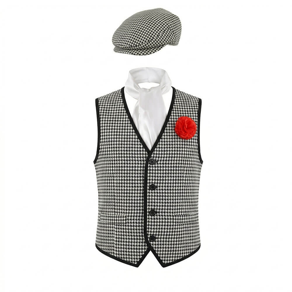 El set incluye un chaleco clásico con el emblemático estampado de cuadros, una parpusa (gorra) a juego que corona el look con distinción, un pañuelo blanco (safo) de tejido ligero y, por supuesto, el imprescindible clavel rojo, el símbolo por excelencia del galán madrileño.